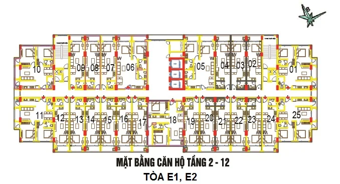 Mặt bằng căn hộ tầng 2-12 tòa E1 E2