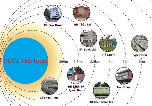 Chỉ trong vòng bán kính 1 km, từ vị trí chung cư PCC1 Vĩnh Hưng có thể tiếp các trường học, bệnh viện, chợ, trung tâm thương mại… Cách trường ĐH Công Nghệ 1 km, cách chợ Vĩnh Hưng 500 m, cách bệnh viện Thanh Nhàn, Vinmec và Bạch Mai 2 km, cách các trường tiểu học lân cận khoảng 800 m