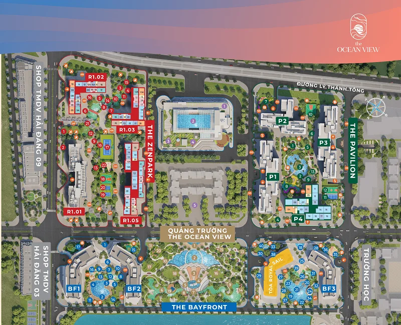 The Ocean View đem đến cho cư dân hệ thống tiện ích đầy đủ tại mỗi phân khu như: hồ cảnh quan, hồ bơi, công viên, khu vui chơi trẻ em, sân thể thao. Cùng với hệ thống tiện ích chung, bao gồm nhà để xe 5 tầng, bể bơi mái vòm, sân chơi trẻ em trên mái, vườn cảnh quan trên mái cùng quảng trường The Ocean View.