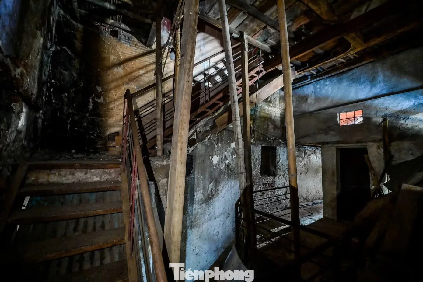 Bên trong chung cư số 207 Hoàng Văn Thụ, cầu thang dẫn lên các tầng 2 lún, nghiêng thấy rõ. Cầu thang lên tầng 3, người dân phải dùng các thanh gỗ và luồng để chống đỡ tạm bợ, mỗi bước chân đều tiềm ẩn nguy hiểm.