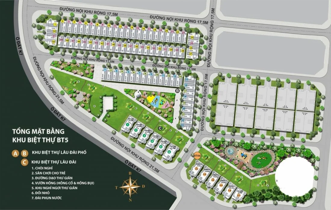 - BT5B: với 23 căn biệt thự, có diện tích 140 m2, nằm trên trục đường nội khu rộng 17,5 m và 11,5 m.
