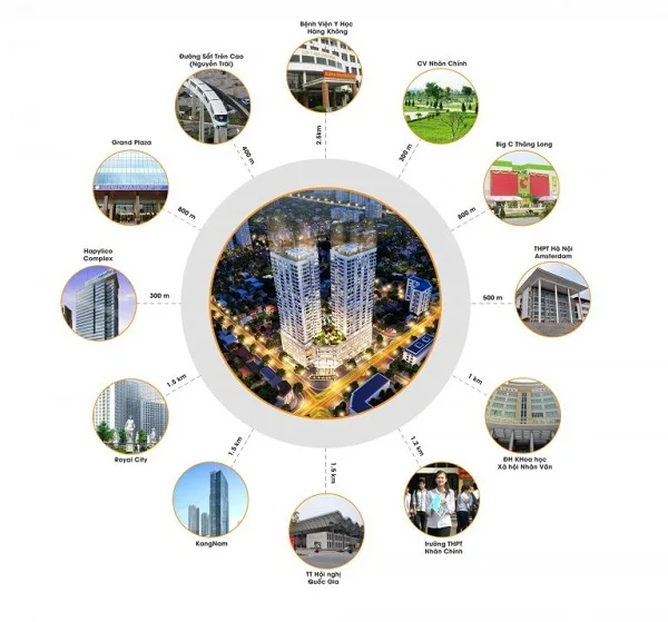 Dự án có vị trí trung tâm, kết nối vùng thuận tiện đến các địa điểm như: 900m đến khu đô thị Trung Hòa Nhân Chính, trường Hanoi – Amsterdam, 700m đến ĐH Khoa học Tự Nhiên và ĐH Khoa học Xã hội và Nhân văn, 1,5km đến BigC Thăng Long, 900m đến Royal City...